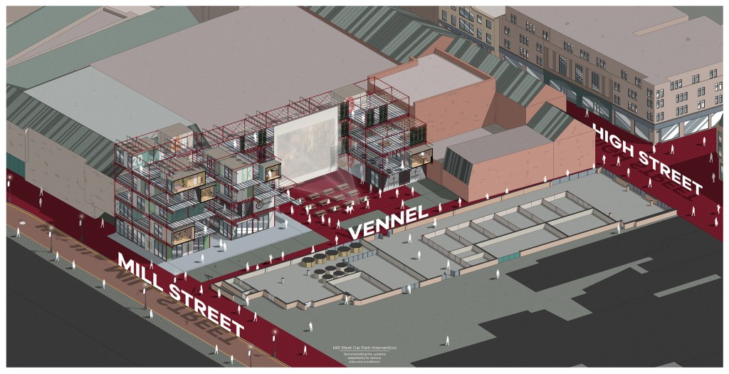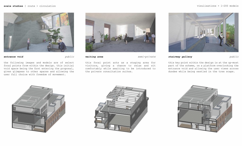 Year 5. Thomas Dougan. Gaps of Uncertainty / Towards a Tactical Architecture. Mill Street intervention.Year 5. Thomas Dougan. Gaps of Uncertainty / Towards a Tactical Architecture. Mill Street perspective section.Year 5. Thomas Dougan. Gaps of Uncertainty / Towards a Tactical Architecture. Rendered views of flexible space and open-air theatre.Year 5. Mishell Parodi. The Skills Library. An extension of the city landscape.Year 5. Mishell Parodi. The Skills Library. Distribution of spaces.Year 5. Waheeda Hanaa Rasool. Mixed Housing Typologies / Creating an Integrated Neighbourhood. Strategic axonometric drawing.Year 5. Waheeda Hanaa Rasool. Mixed Housing Typologies / Creating an Integrated Neighbourhood. Typology and spatial studies.Year 5. Waheeda Hanaa Rasool. Mixed Housing Typologies / Creating an Integrated Neighbourhood. Internal and external renders. Year 5. Elliot Reilly. The Traditional Urban Block / A Sustainable Model for City Living. Comic book strip.Year 5. Elliot Reilly. The Traditional Urban Block / A Sustainable Model for City Living. Perspective section.Year 5. Veera Kivela. The Other and the Morphology of Absence / Building a Feminist Neighbourhood in Dundee. Rendered aerial view.Year 5. Veera Kivela. The Other and the Morphology of Absence / Building a Feminist Neighbourhood in Dundee. Axonometric.Year 5. Jack Buchan. One Size Doesn’t Fit All / Flexible Architecture for Victims of Domestic Abuse. Studies in flexible architectural elements. Year 5. Jack Buchan. One Size Doesn’t Fit All / Flexible Architecture for Victims of Domestic Abuse. Illustrative render.Year 5. Liga Ramata. Everyday Life in Microrayons / An Inquiry into the Future of Microrayons in Former Socialist States. View of proposed redeveloped communal blocks.Year 5. Liga Ramata. Everyday Life in Microrayons / An Inquiry into the Future of Microrayons in Former Socialist States. Axonometric of proposed communal blocks.Year 5. Richard Stalker. An Ecological Approach to Architectural Aesthetics. Flat axonometric of the Abrahamic Centre.Year 5. Richard Stalker. An Ecological Approach to Architectural Aesthetics. External views and plans.Year 5. Richard Stalker. An Ecological Approach to Architectural Aesthetics. Internal views and section.Year 5. Jenna Craig. Liberating the Ground / Rhythmanalysis / The Non-Investible City. Visual study.Year 5. Jenna Craig. Liberating the Ground / Rhythmanalysis / The Non-Investible City. Layered Anatomy from Ground to Air.Year 5. Jenna Craig. Liberating the Ground / Rhythmanalysis / The Non-Investible City. Rhythmanalysis Investigated in Dundee City Centre.Year 5. Calum Ramsay. The Cauldron. Perspective.Year 5. Calum Ramsay. The Cauldron. Sectional perspective.Year 4. Huiting Xie. MIND OASIS / Clustered Community Design for Autistic Spectrum Disorders. The Community in Context.Year 4. Huiting Xie. MIND OASIS / Clustered Community Design for Autistic Spectrum Disorders. Ground floor plan and street views.Year 4. Chelseigh Buchanan. Nurture / A Micro-Community. Site field study.Year 4. Chelseigh Buchanan. Nurture / A Micro-Community. Rendered view of private gardens.Year 4. Chelseigh Buchanan. Nurture / A Micro-Community. Rendered view of mixed studios.Year 4. Kamen Rusev. A Knowledge Surface. Circulation and a rising floor.Year 4. Kamen Rusev. A Knowledge Surface. Floor plans.Year 4. Kamen Rusev. A Knowledge Surface. Rendered view of internal piazza.Year 4. Rozalina Hristova. Eco-Educational Centre / A Holistic Approach to Sustainability. Section.Year 4. Rozalina Hristova. Eco-Educational Centre / A Holistic Approach to Sustainability. Urban Farm.Year 4. Marcus Myles. Woolworks. Rendered view of interior street.Year 4. Sam Morman. Incubator for Creative Culture, Perth. Sectional Perspective / Journey.Year 4. Sam Morman. Incubator for Creative Culture, Perth. Study of Atrium.Year 4. Sam Morman. Incubator for Creative Culture, Perth. Study of Multifunctional Space.Year 4. Laura Moldovan. The Media Store. View of the Media Archive.Year 4. Laura Moldovan. The Media Store. View entering the Media Storage Core.Year 4. Jiahui Li. Solomo Hitchhiker in Colon, Panama. Parallel Perspective Explosion.Year 4. Jiahui Li. Solomo Hitchhiker in Colon, Panama. General section.Year 4. Thao Vi Nguyen. The South Campus Library. The Collective Hybrid.Year 4. Thao Vi Nguyen. The South Campus Library. External view.Year 4. Thao Vi Nguyen. The South Campus Library. Internal views.Year 4. Julia Baeck. Anglenosa Oxygen Injection Plant and Visitor Centre, Panama. Rendered view.Year 4. Julia Baeck. Anglenosa Oxygen Injection Plant and Visitor Centre, Panama. Section.Year 4. Evan McColl. The Hilltown Collective. Elevation Study / Tenements of the Hilltown.Year 4. Evan McColl. The Hilltown Collective. Perspective Section.Year 4. Emilia Chegini and Wei Zheng Li. The Transient Recipro-city. Notion Distortion / An Abstracted Conclusion.Year 4. Emilia Chegini and Wei Zheng Li. The Transient Recipro-city. View upon landing.Year 3. Monika Walawender. Faith Between Earth and Sky. Exterior view.Year 3. Monika Walawender. Faith Between Earth and Sky. Interior view of church room.Year 3. Ross Robson. A Centre of Didactic Making. Axonometric study.Year 3. Ross Robson. A Centre of Didactic Making. Contextual view on Perth Road.Year 3. Kuba Duda. Journey of the Spirit. Cross section.Year 3. Kuba Duda. Journey of the Spirit. Street perspective.Year 3. Jasmiina Knaapi. Public Library in Dundee / Integrating Faith and Wellbeing. Strategic plan and model image.Year 3. Jasmiina Knaapi. Public Library in Dundee / Integrating Faith and Wellbeing. Long section.Year 3. Andrew Dennison. Studio 190. Rendered street view.Year 3. Andrew Dennison. Studio 190. Rendered view of pottery studio.Year 3. Emma Sjoholm. Floating in Space. View of Sento inspired pools.Year 3. Emma Sjoholm. Floating in Space. Model, exterior view, and view of the Atmospheric Bath.Year 3. Beatrice Ryan. In Search of Silence. Render of the Cloister – a transi